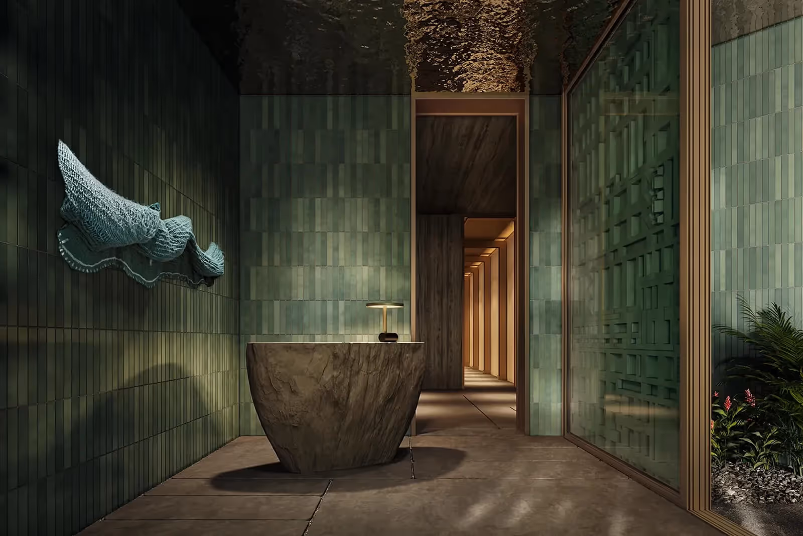 - Extensive amenity program including fitness & wellness spaces, spa, squash court, podcast studio, lounges, and entertainment areas.
